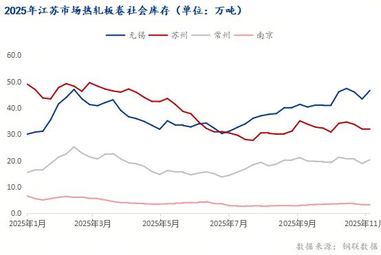 分城市来看,苏州社会库存从年初近49万吨的高位持续下滑至11月的32.1万吨,降幅达34.5%。原因是苏州库存主要是沙钢在玖隆库的库存,一方面,沙钢出口订单旺盛与直供比例提升,分流并减少了投放的资源;另一方面,品种卷效益更优,促使铁水与产能向高附加值产品倾斜,进一步压缩了普材的市场投放份额。而无锡市场汇集了来自北方、周边其他钢厂的资源,更能反映江苏市场的供需情况,在本地资源投放较少的情况下,库存由年初的30多万吨的低点增长至如今的46万吨,这表明来自省外的资源冲击持续且强劲,完全填补了本地供给的缺口,而下游的实际需求却无法有效消化这部分增量。这导致供需矛盾在的持续累积,使其成为区域价格风险的集中点,其后续的库存去化情况将直接决定全省价格的走向。