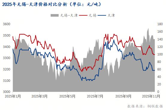 分阶段来看1-4月价差从年初的110-150元/吨的高位开始,在4月份显著收窄至30-50元/吨的年内最低水平。主要原因是春节期间,北方施工停滞,资源集中南下,江苏作为主要消费地承担了库存压力,价格相对坚挺,维持了较高的区域价差。节后,北方需求复苏缓慢,而钢厂复产导致本地供应压力巨大,天津价格承压快速下跌。同时,江苏地区去库速度不及预期,两地价格共同下跌,但北方跌幅更深,导致价差急剧收窄。5-7月价差在60-120元/吨区间见底后快速拉大至年内峰值170元/吨。在此期间随着利好政策出台,市场信心提振。华东作为经济最活跃的地区,需求响应速度较快,无锡价格率先领涨反弹。而北方市场因基本面改善较慢,价格跟涨滞后,导致价差迅速扩大。价差超过150元/吨,为北材南下创造了丰厚的套利空间,刺激了资源流动。然后价差从7月的高位回落,在8月达到低谷,随后在9月又反弹至100-140元/吨。进入四季度,市场进入供需弱平衡状态,价差在110-150元/吨的区间内稳定波动。
