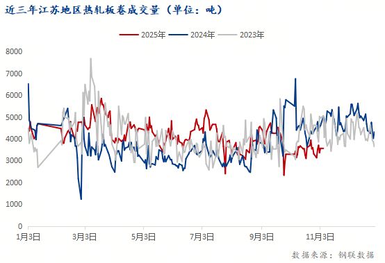 据Mysteel调研江苏市场21家样本企业近三年成交情况来看,需求呈现“总量收缩,波动收窄,淡季特征淡化”的特征,2023年日均成交量约为4280吨,2024年日均成交量约为4380吨,2025年日均成交量约4150吨。2025年的需求相较于前两年出现了明显的下滑,降幅约为5%-3%,表面了市场环境下,制造业、出口等下游领域对热卷的直接需求与贸易商的投机需求双双转弱。另外季节性规则出现弱化,在传统的“金三银四”、“金九银十”时期,2025年的成交量并未出现显著放量,峰值水平远不及2023与2024年同期。7-8月传统淡季的成交量,与全年其他时段相比并未出现大幅落差,反映出需求全年均处于不温不火的状态,季节性波动被熨平。