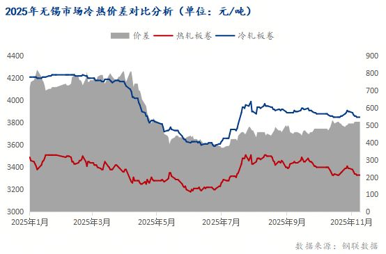 2025年江苏市场冷热价差经历了从“高位震荡”到收敛后“回归常态”的周期,全年价差波动剧烈,最高达820元/吨,最低至370元/吨。年初的1-4月价差维持在750元/吨左右的高位,开年以来热轧价格处于低位,为冷轧提供了较高的加工利润空间,加上市场对金三银四传统制造业旺季抱有强烈预期,冷轧价格在预期支撑下更为坚挺。5-7月价差开始下跌,从4月底的810元/吨跌至7月底的370元/吨,跌幅超过50%。主要原因是旺季需求落空,下游家电、汽车等行业订单疲软,无法支撑高价的冷轧产品,热轧作为原料,跌幅相对滞后,导致价差被迅速挤压,加上冷轧社会库存高企,钢厂和贸易商面临巨大的资金和销售压力,被迫降价抛售。8-11月价差触底并展开震荡,重心较上半年大幅下移,在此期间价差缩小至部分冷轧厂的生产成本,随着减产检修,供给收缩支撑了价差底部。加上下半年宏观政策托底,制造业需求略有回暖,但力度有限。冷热轧价格进入联动震荡期,预计后续冷热价差将维持在区间内震荡。