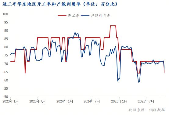 2025年,华东地区钢厂生产整体呈现“前高后低、中枢下移”的运行特征。无论是开工率还是产能利用率,其全年运行水平均系统性低于2023年及2024年,反映出供给端的主动收缩。具体来看,开工率多数时间维持在71%左右,较前两年高位明显回落;产能利用率波动加剧,整体均值已降至80%以下区间。这一结构性变化导致对江苏及华东区域资源投放量同比缩减,成为支撑2025年钢价在深度回调后企稳反弹的关键供给侧因素。全年来看,华东钢厂普遍通过减产与检修调节生产节奏,在一定程度上缓冲了市场供需矛盾,为价格提供了底部支撑。